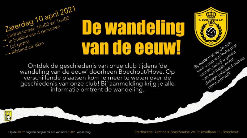 Zaterdag 10 april 2021 is die befaamde 100ste dag. Kom per bubbel van maximum 4 personen (of gezin) naar onze terreinen en meld je aan. Je krijgt dan de wandelroute waarin je veel meer te weten komt over de geschiedenis van onze club terwijl je doorheen Boechout (en een klein stukje Hove) wandelt.